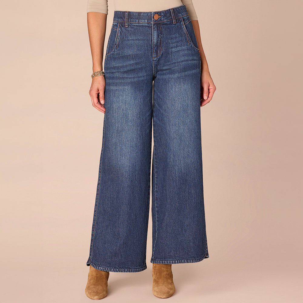 This missy "Ab"solution® Wide Leg with a tulip hem is fitted through the hips with a relaxed, wide opening through the legs and a curved notch at the hem. Engineered with our signature fit technology to smooth, support, and enhance your shape—giving you everything from a flatter tummy to a perkier rear view.