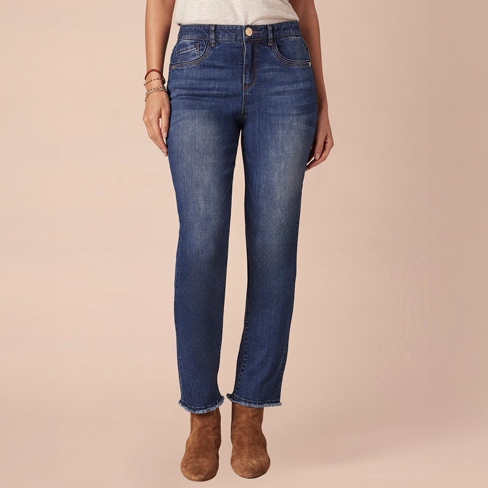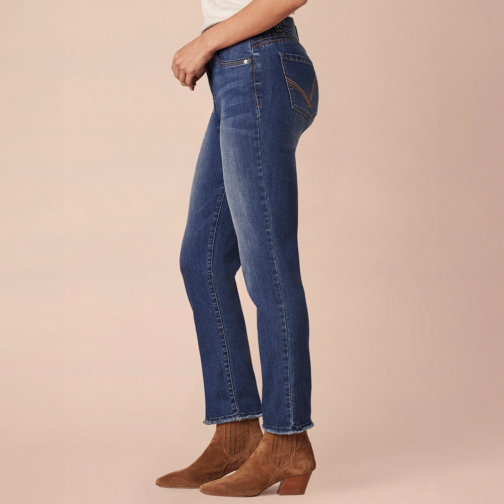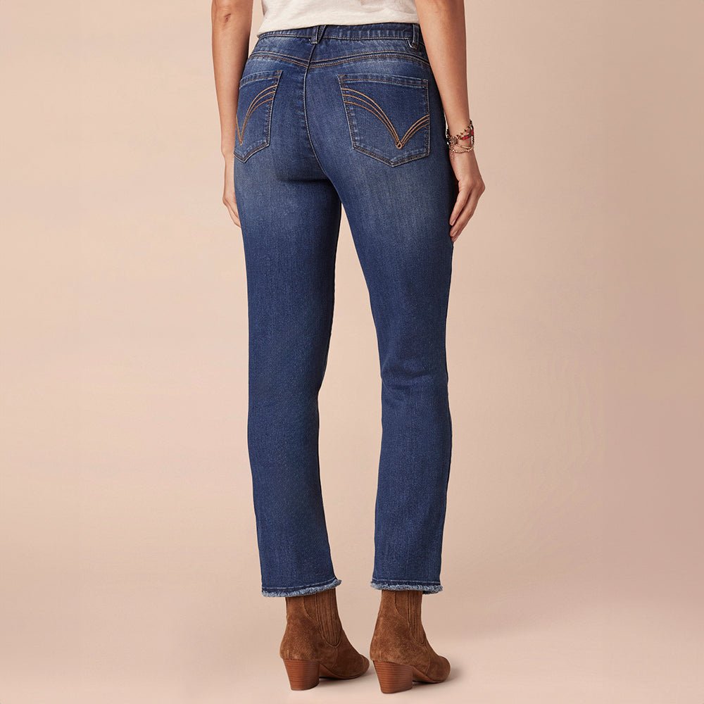 The missy Slim Straight jean is a slimmer alternative to the classic straight-leg. It fits closely through the hips and legs, finishing with a relaxed, ankle-length opening. Designed with a classic blue wash, embroidered cascading “D” back pockets, a clean finish fray hem, and engineered with "Ab"solution® fit technology to smooth, support, and enhance your shape.