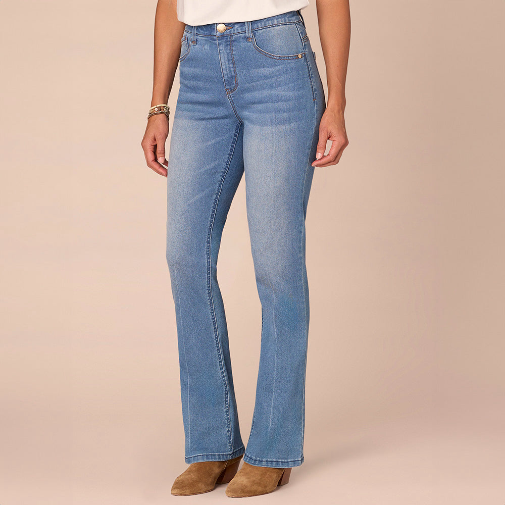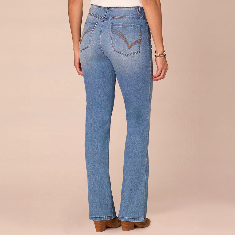 The petite Itty Bitty Bootcut jean is fitted from the hips to calves, with a baby bootcut leg opening that creates a lengthening effect. Featuring embroidered cascading “D” pockets and engineered with "Ab"solution® fit technology to smooth, support, and enhance your shape—giving you everything from a flatter tummy to a perkier rear view. Made with recycled REPREVE® materials for a greener solution.