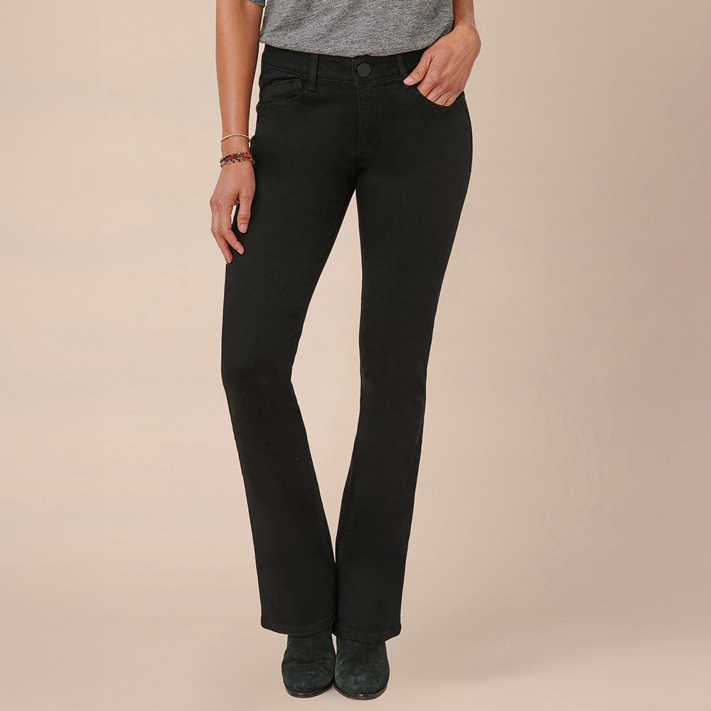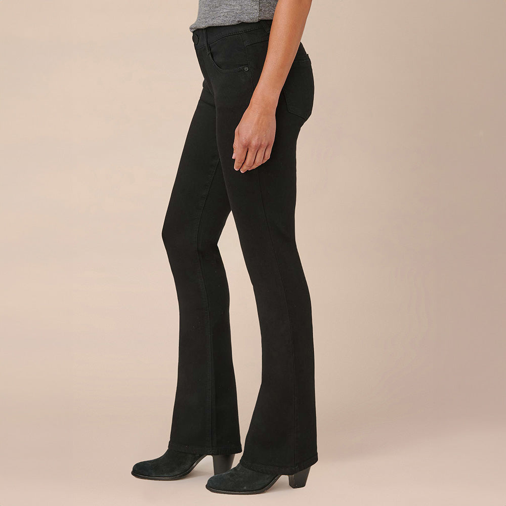 The petite Itty Bitty Bootcut jean is fitted from the hips to calves, with a baby bootcut leg opening that creates a lengthening effect. Crafted from premium stretch black denim and engineered with "Ab"solution® fit technology to smooth, support, and enhance your shape—giving you everything from a flatter tummy to a perkier rear view.