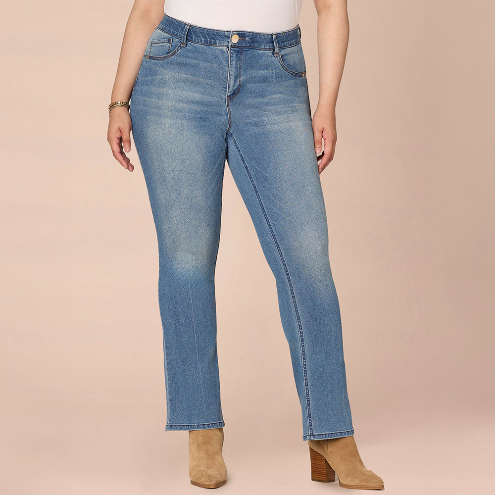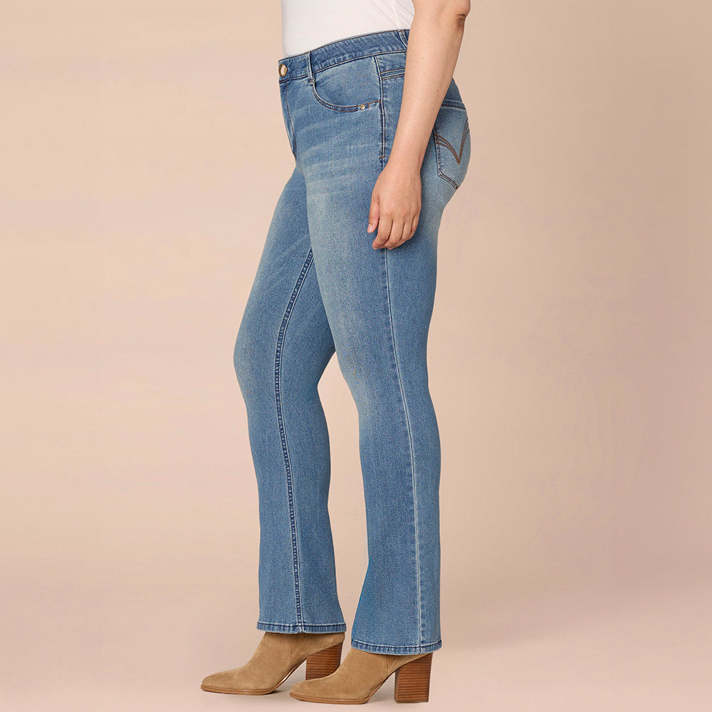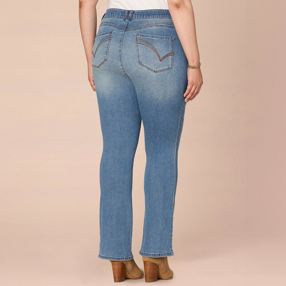The plus size Itty Bitty Bootcut jean is fitted from the hips to calves, with a baby bootcut leg opening that creates a lengthening effect. Featuring embroidered cascading “D” pockets and engineered with "Ab"solution® fit technology to smooth, support, and enhance your shape—giving you everything from a flatter tummy to a perkier rear view. Made with recycled REPREVE® materials for a greener solution.