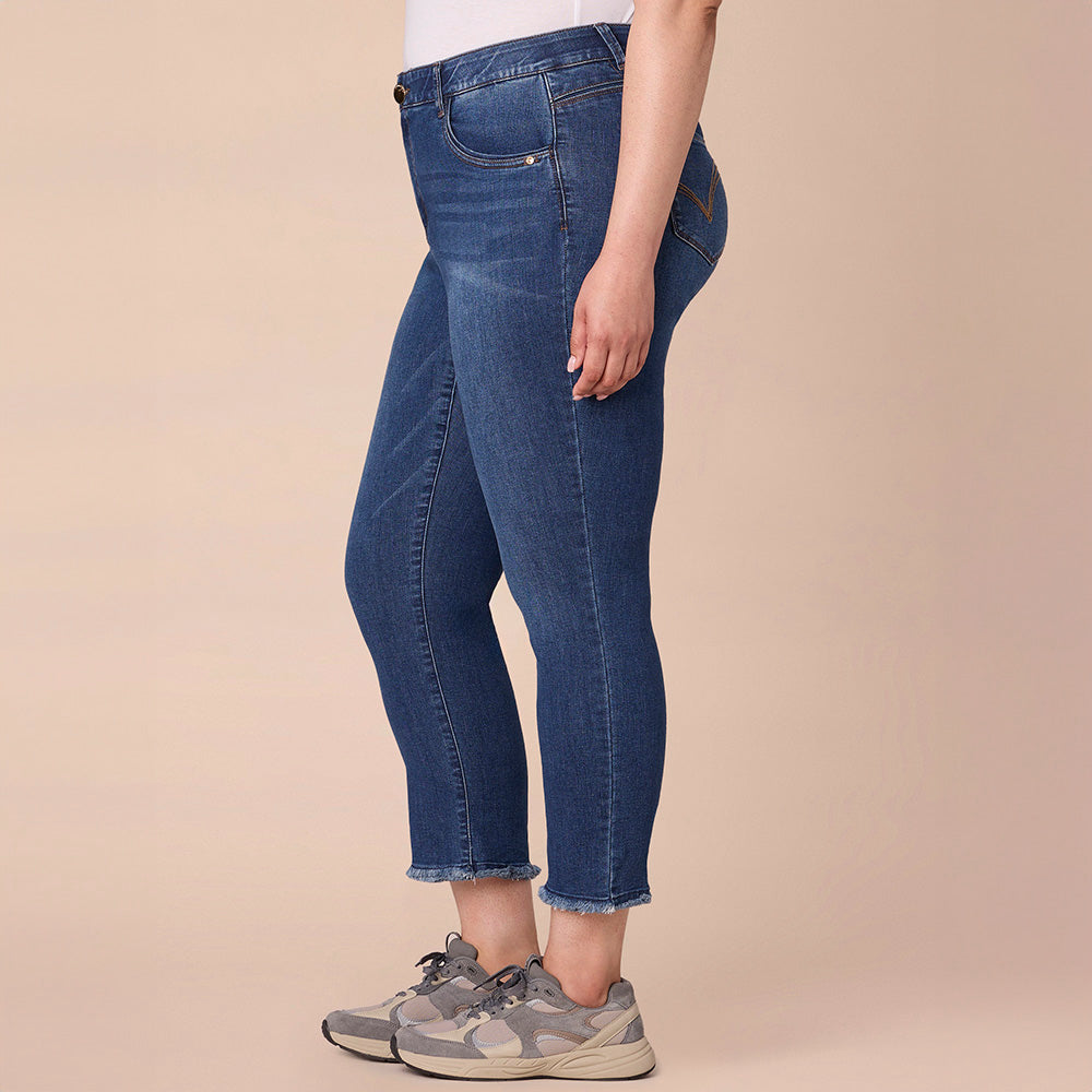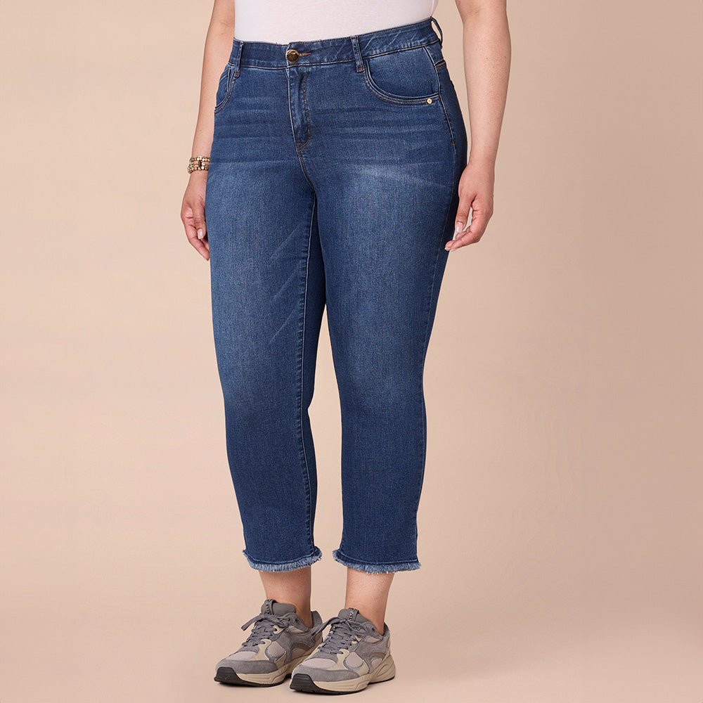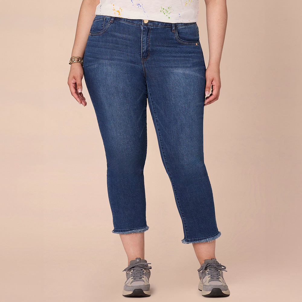 The plus size Slim Straight jean is a slimmer alternative to the classic straight-leg. It fits closely through the hips and legs, finishing with a relaxed, ankle-length opening. Designed with a classic blue wash, embroidered cascading “D” back pockets, a clean finish fray hem, and engineered with "Ab"solution® fit technology to smooth, support, and enhance your shape.
